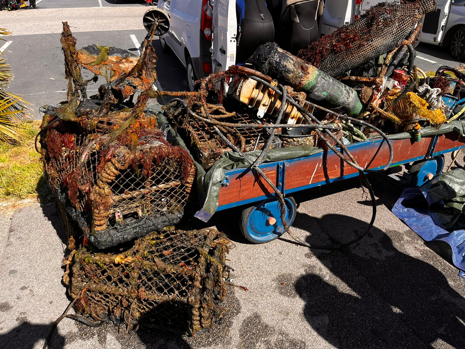 Comme il s’agit de pontons réservés aux abonnés, les plongeurs ont remonté des cordages, des cannettes et bouteilles et des engins de pêche, essentiellement des casiers dont un contenait 2 gros homards bien vivants et qui ont retrouvé la liberté. D’autres casiers ont été laissés au fond car ils sont déjà bien colonisés, ils ont simplement été rendu non-pêchant.