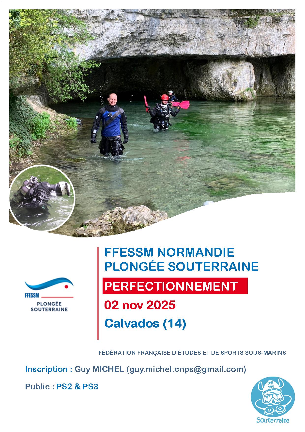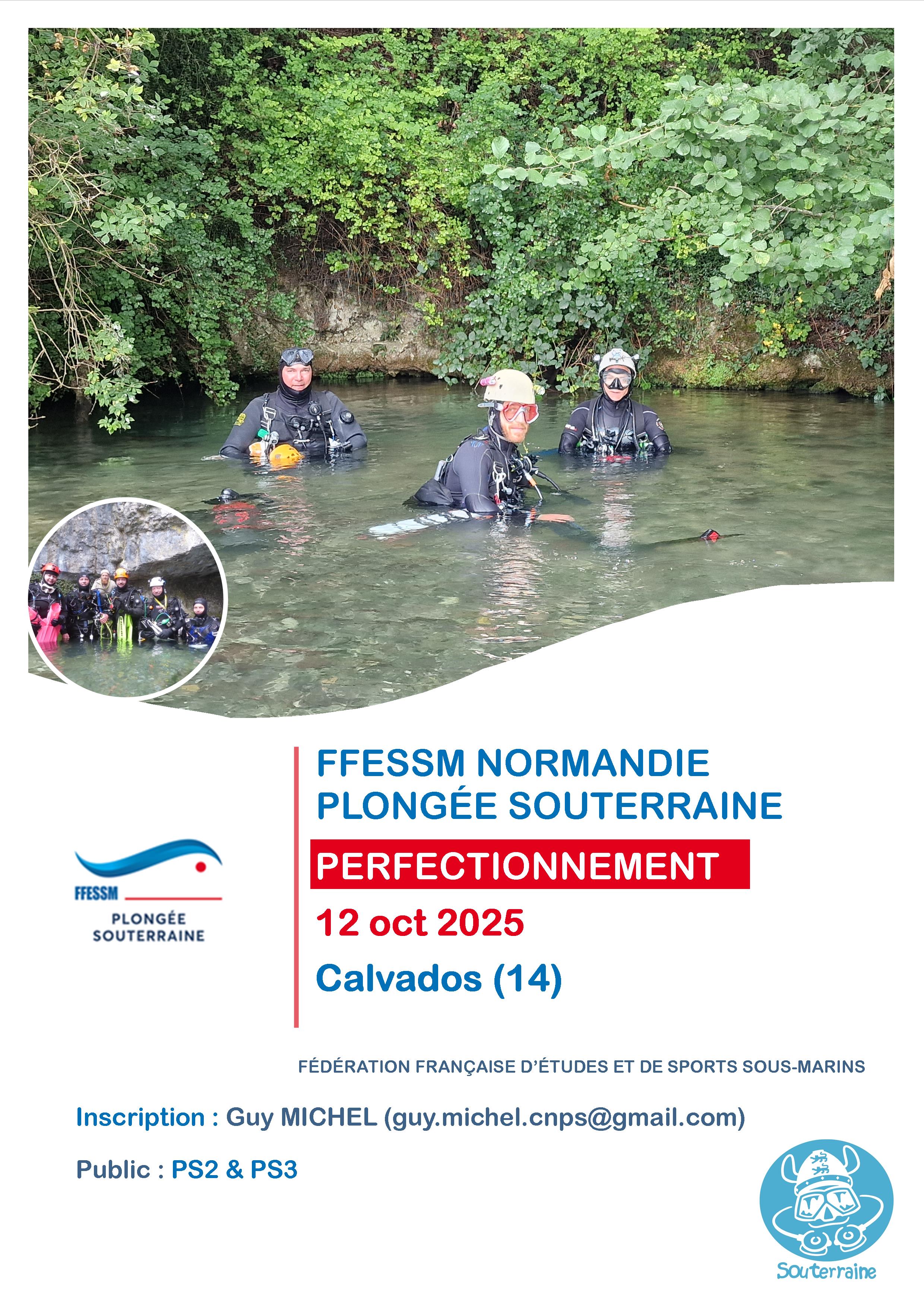 En cliquant ci-dessous, accédez aux affiches des sorties et formations de plongée souterraine prévues.Sortie du 12 octobre 2025 dans le Calvados